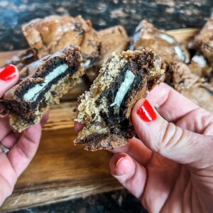 Take 9 oreo cookies and lay them on top of the chocolate chip cookie dough
