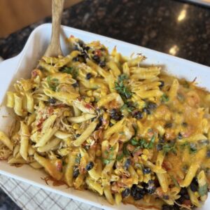 In casserole dish add cooked pasta, cooked chicken, drained corn, rinsed and drained black beans, drained rotel and chicken broth and about 1 cup of cheese and mix together well.